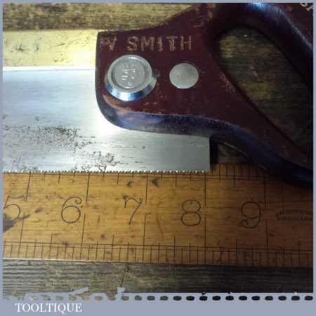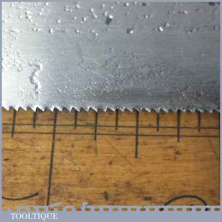 The saw has been thoroughly cleaned, jointed, resharpened and set by hand so that all the hard work of getting an old vintage saw right has been undertaken. We do this so that the next sharpening is easier and no more than a quick freshen up would be required. Those who are familiar with sharpening will know this is no small job and requires skill, effort and time to achieve good results.