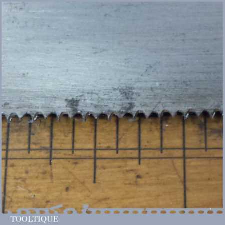 The saw has been thoroughly cleaned, jointed, resharpened and set by hand so that all the hard work of getting an old vintage saw right has been undertaken. We do this so that the next sharpening is easier and no more than a quick freshen up would be required. Those who are familiar with sharpening will know this is no small job and requires skill, effort and time to achieve good results.