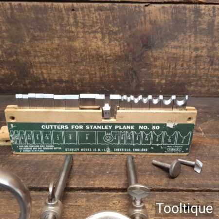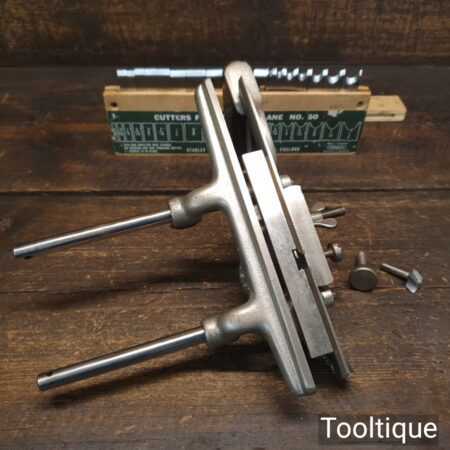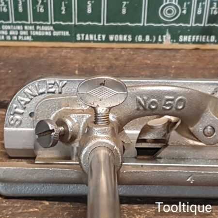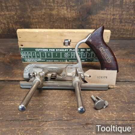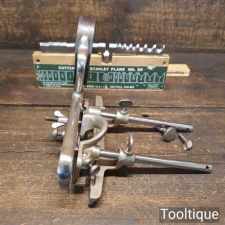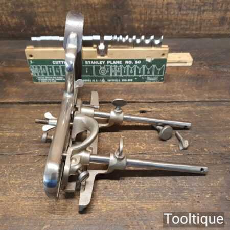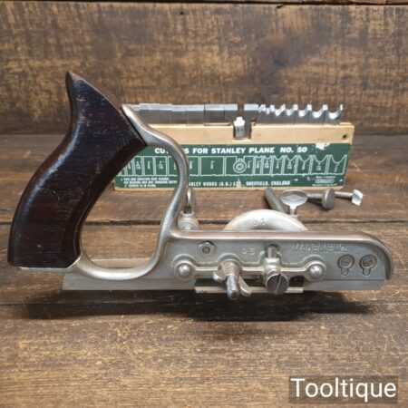 Vintage Stanley England No: 50 combination plough plane complete with 17 cutters, fully refurbished and ready for use. The plane is in good condition and all components move smoothly. Note: We do not sharpen the irons.