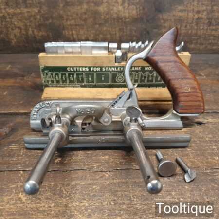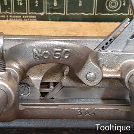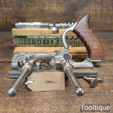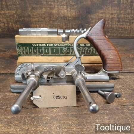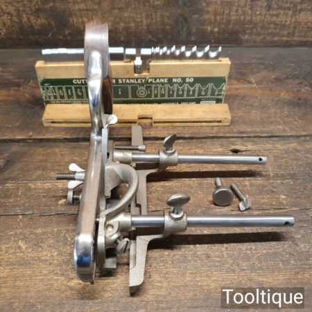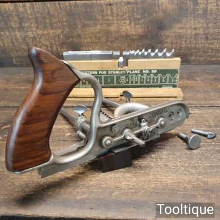 Vintage Stanley of England No: 50 combination plough plane complete with 17 cutters, fully refurbished and ready for use. The plane is in good condition and all components move smoothly. Note: We do not sharpen the irons.