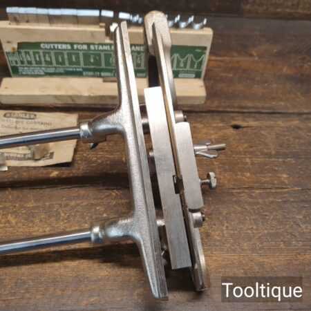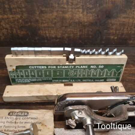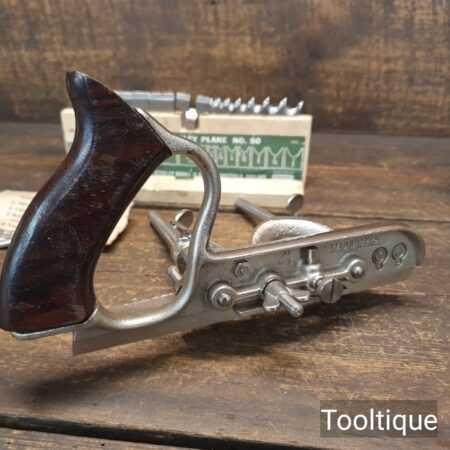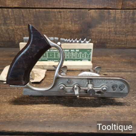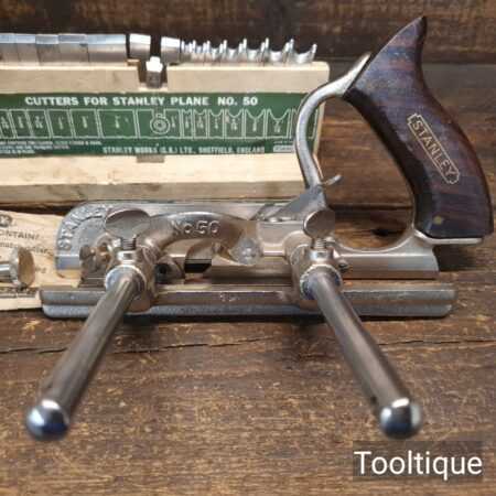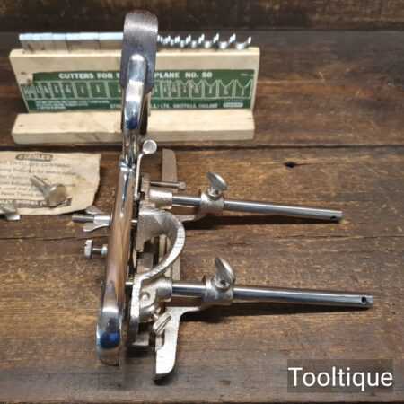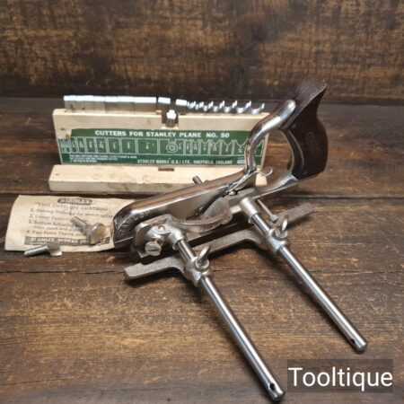 Vintage Stanley of England No: 50 combination plough plane complete with 17 cutters, fully refurbished and ready for use. The plane is in good condition and all components move smoothly. Note: We do not sharpen the irons.