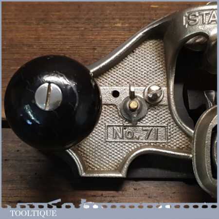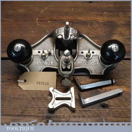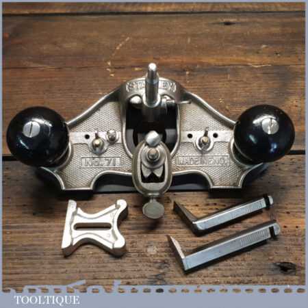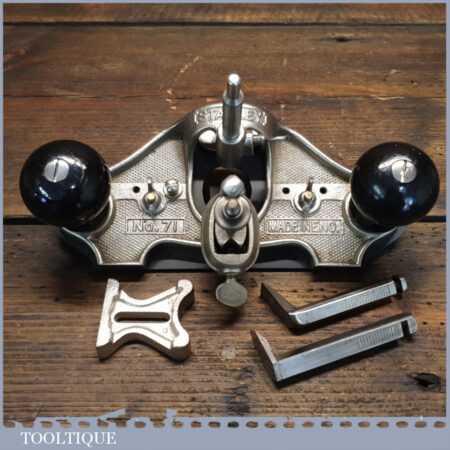 Vintage Stanley England No: 71 hand router plane complete with fence, depth stop and 3 irons and in little used condition. Note: comes with a craftsman made sole plate that closes the throat.