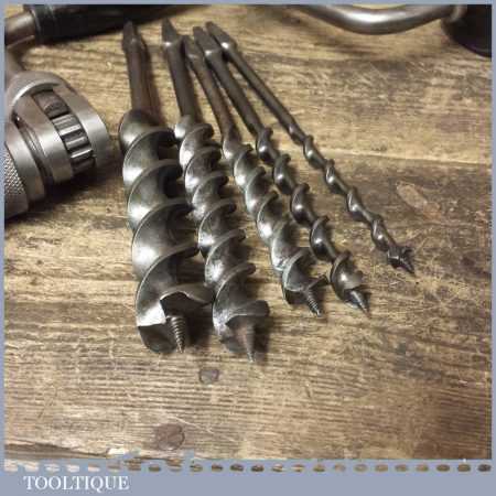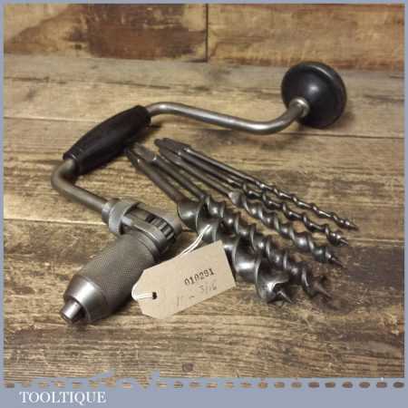 Vintage Stanley No 144 carpenter’s ratchet brace with a 10” swing and set of 5 No: bits (3/16” – 1”) by various makers, in good working order and ready for use.