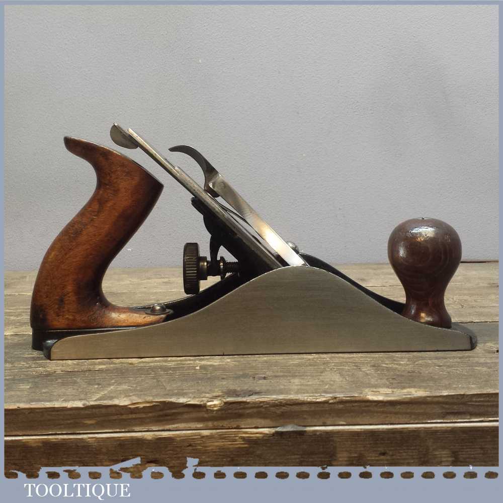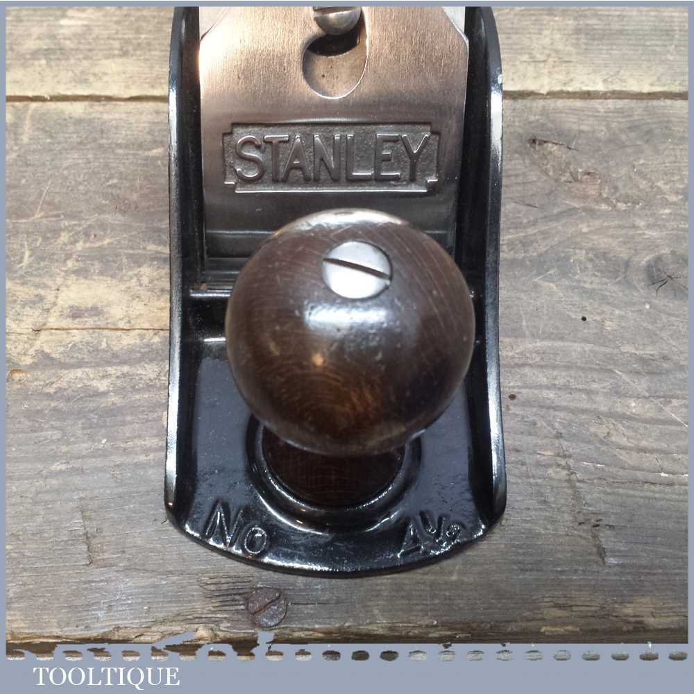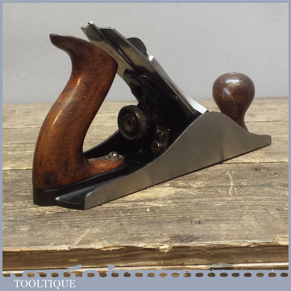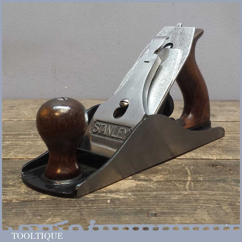 Vintage Stanley No: 4 ½ Smoothing plane made in the USA and is fully refurbished ready to use. This plane was made in the 1940’s when certain metals were rationed thus why there is a Bakelite adjuster screw and no nickel coating to the cap iron.