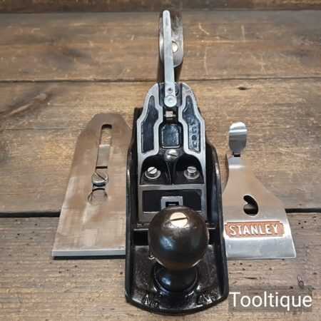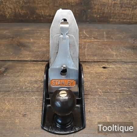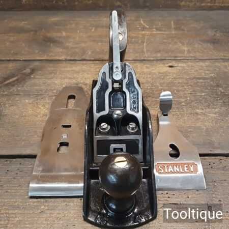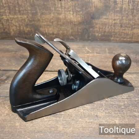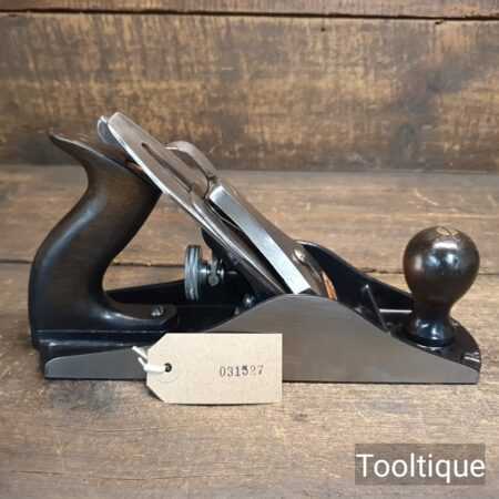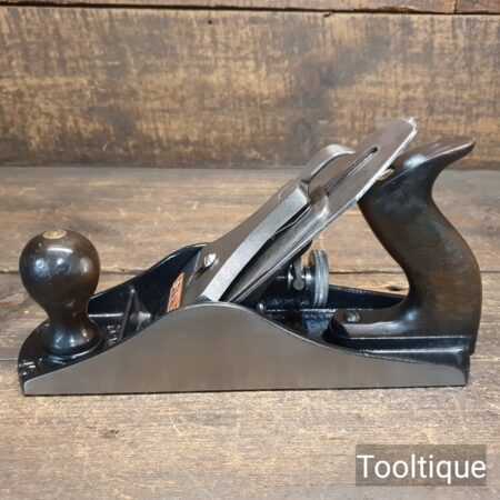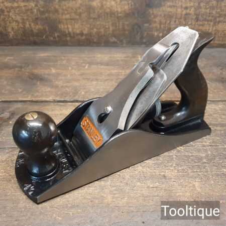 Vintage Stanley England No: 4 ½ wide bodied smoothing plane with a 2 3/8” iron, fully refurbished ready for use and in good used condition. When refurbishing planes, we do not merely clean them to make them look good, these are restored to a level that ensures each plane is actually ‘in plane to within 0.02mm’ sharpened, honed and all the components are thoroughly cleaned so that they move freely. Our planes are specifically reconditioned to satisfy professional tradesmen who will instantly know the difference between buying one of our planes over general other used ones.