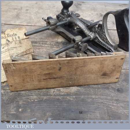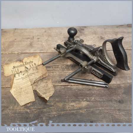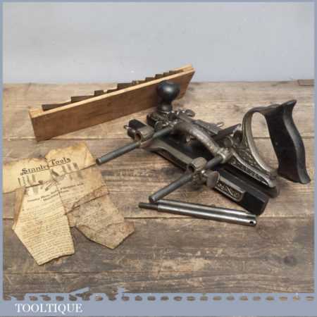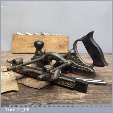 Vintage Stanley No: 46 skew blade combination plane complete with cutters. It’s rare to find these with the irons and spare arms.
