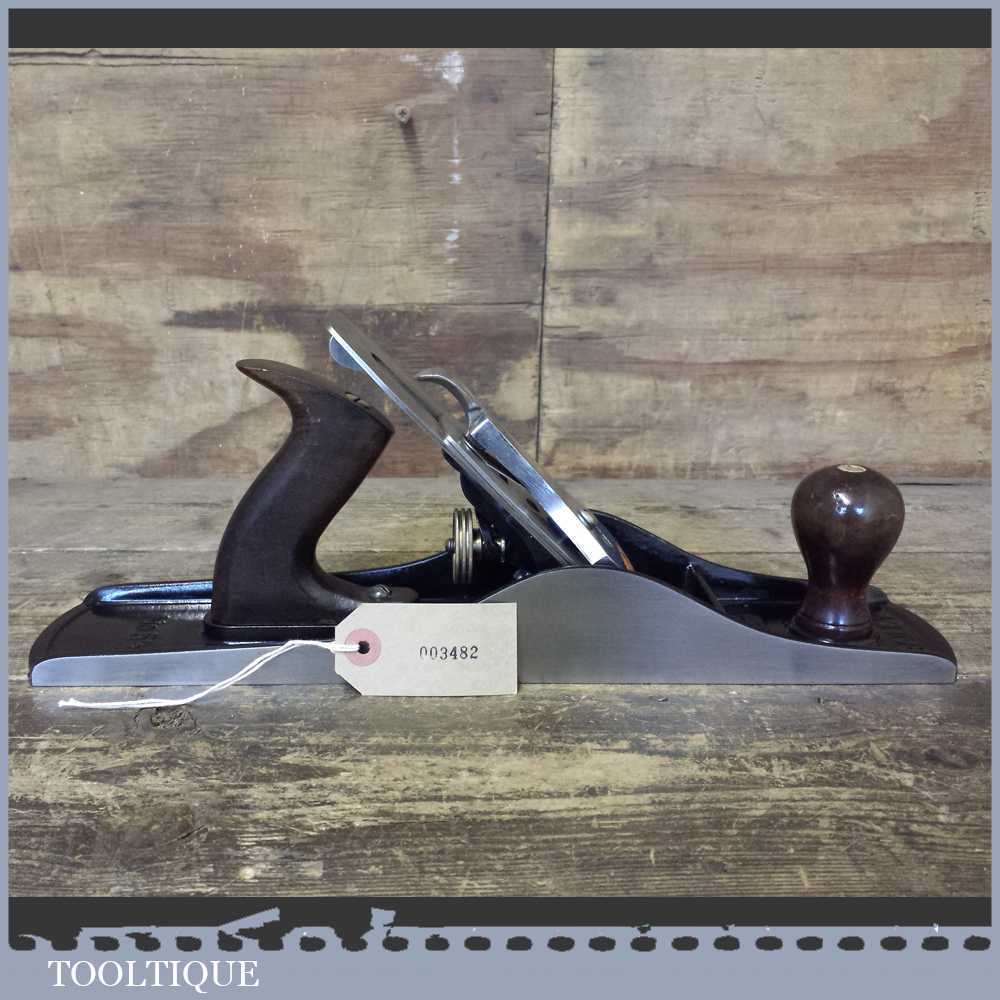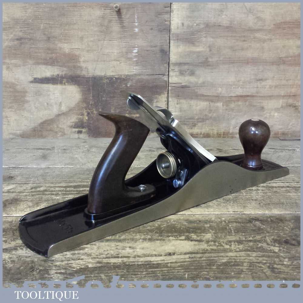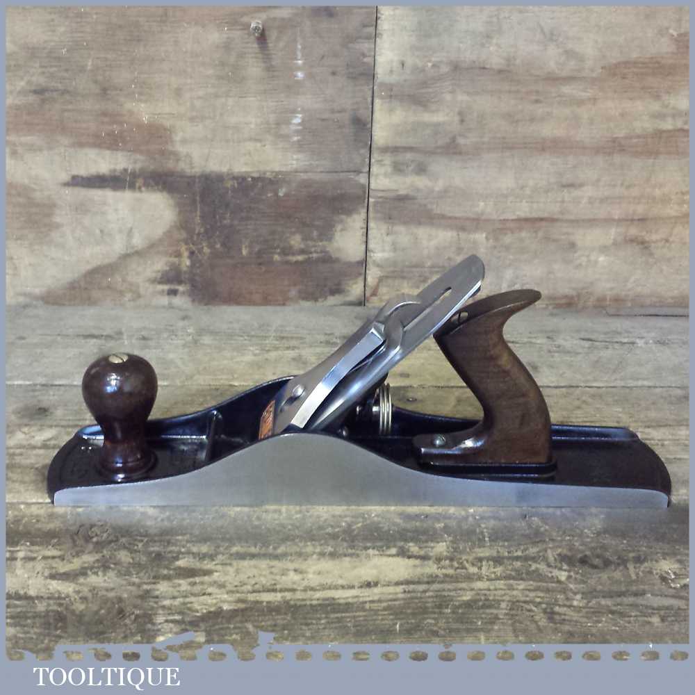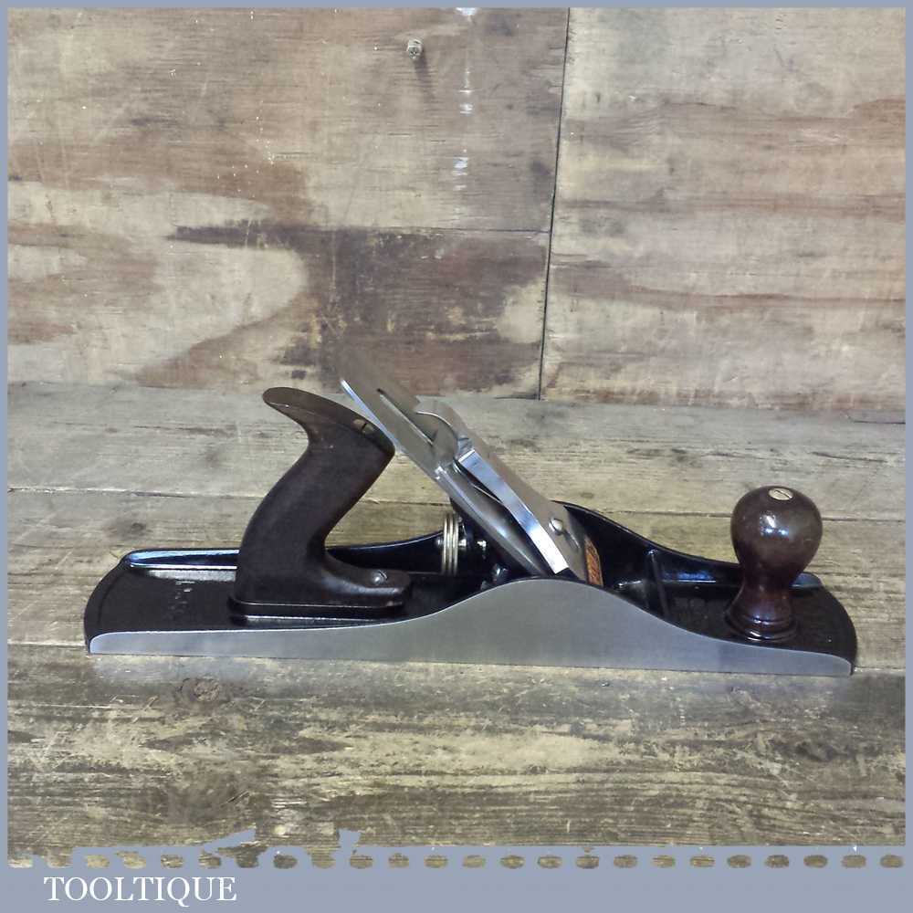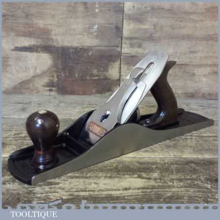 When refurbishing planes we do not merely clean them to make them look good, they are restored to a level that ensures they are actually ‘in plane’ sharpened, honed and all the components are thoroughly cleaned so that they move freely. Our planes are specifically reconditioned to satisfy professional tradesmen who will instantly know the difference between buying one of our planes over general other used ones. Our aim with reconditioning these planes as we do is to reduce tear out by refining the plane so it can be set up to take a very fine shaving. For new woodworkers: Note that we also refine the set up of the chipbreaker which is often neglected in other planes giving you the best possible start.