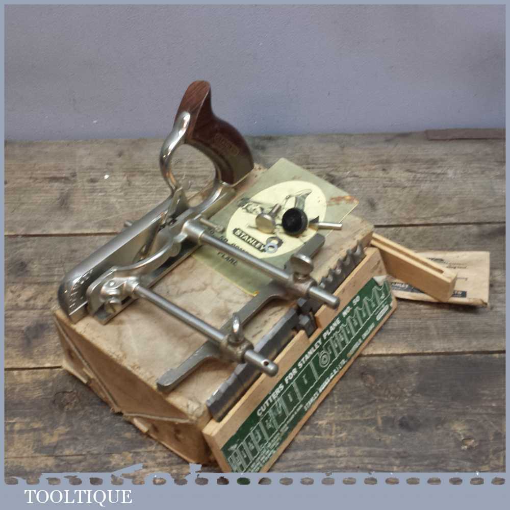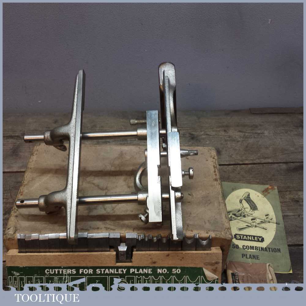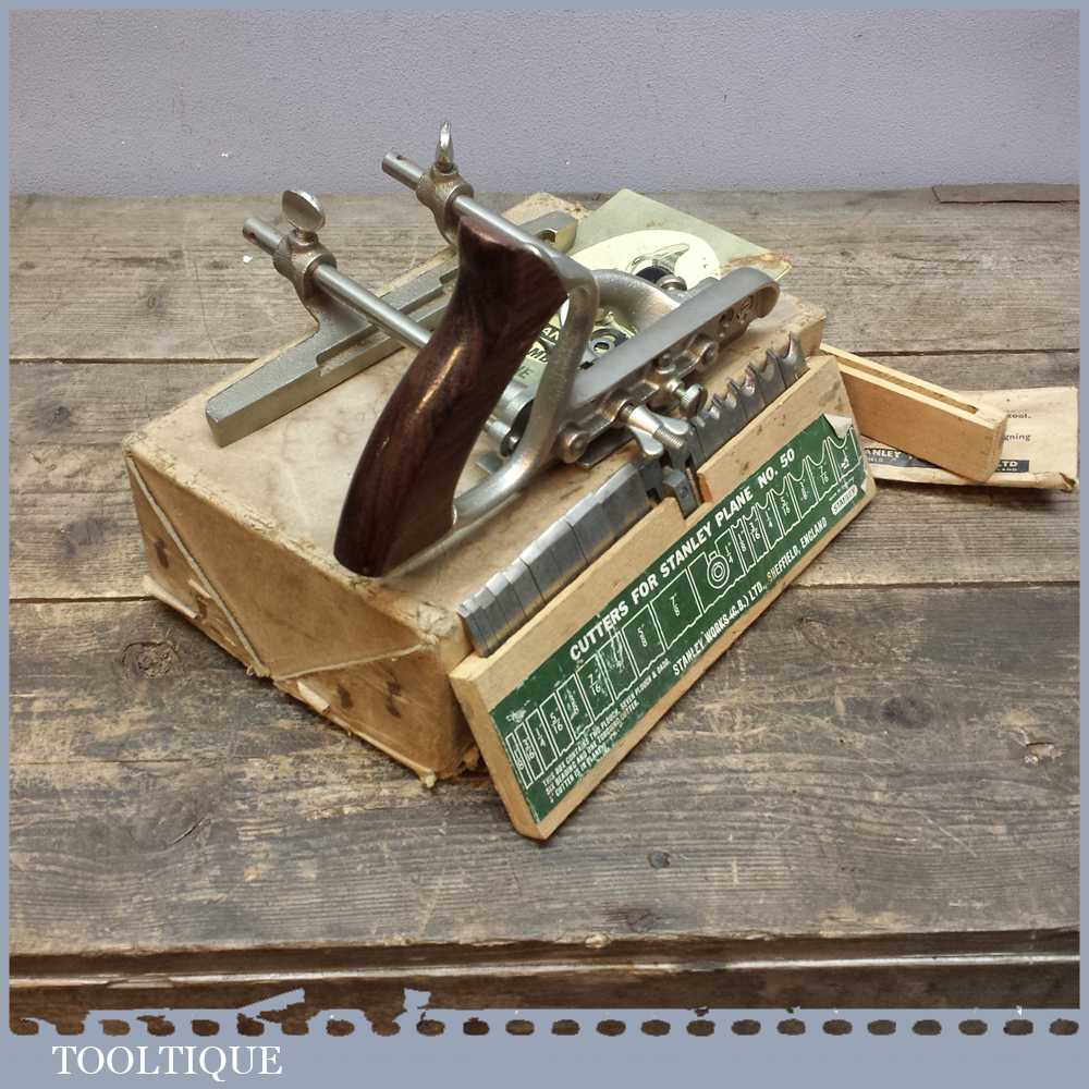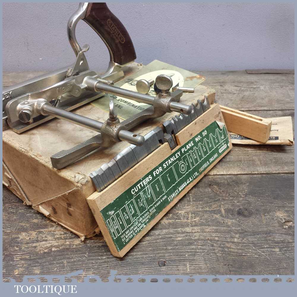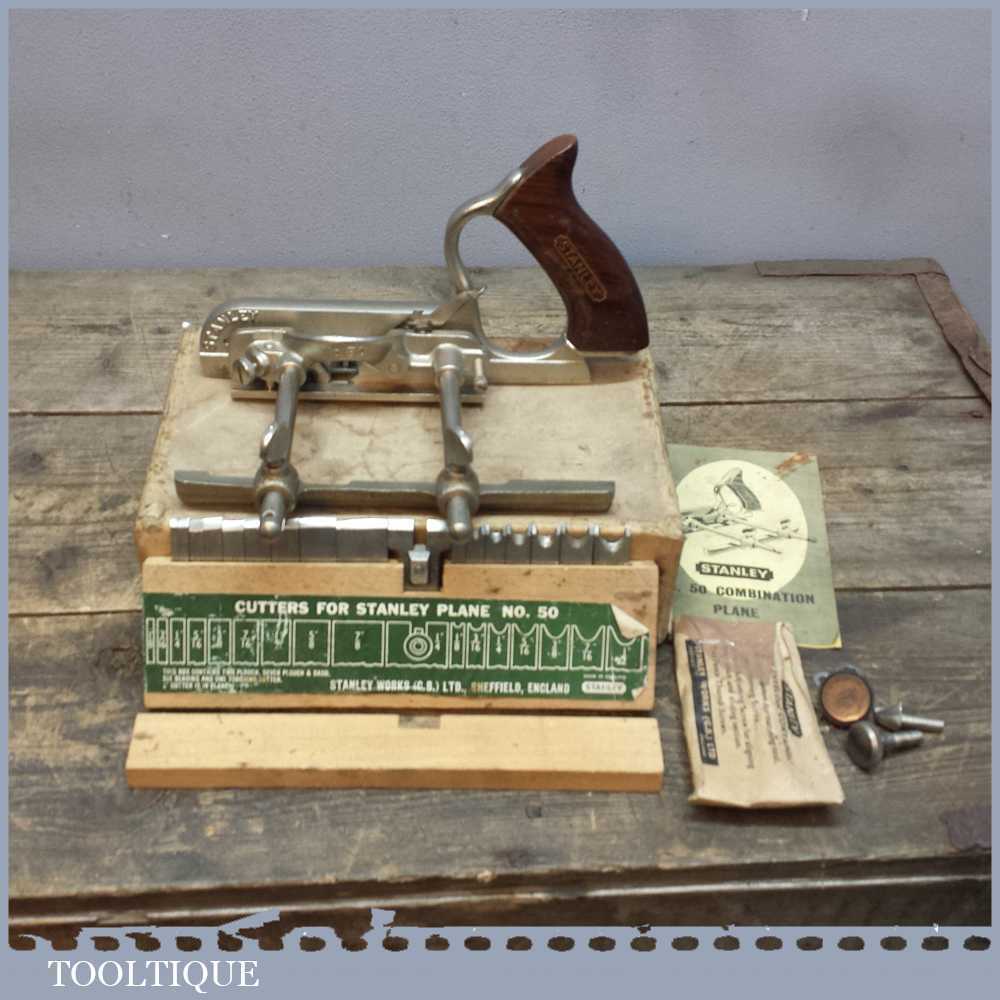 Vintage Stanley No: 50 combination plough plane in very good used condition. It has a full set of cutters and moves freely.