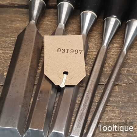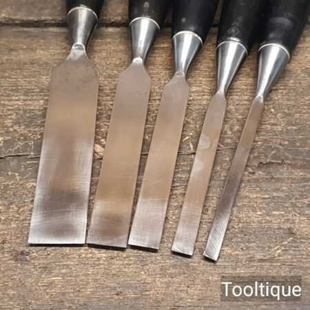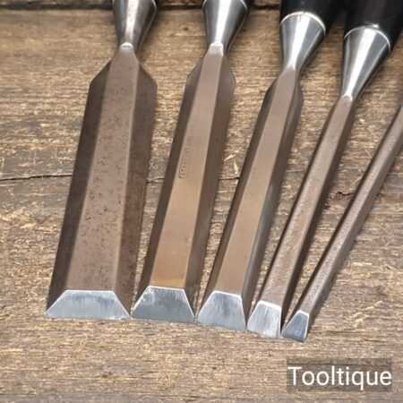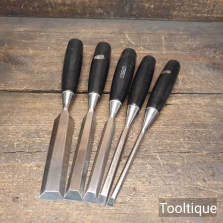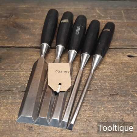 Vintage Stanley England No: 5001 set of 5 No: bevel edge chisels, fully refurbished ready for use and in good used condition. All refurbished chisels are water cooled during the sharpening & flattening process to ensure the tempering is not affected