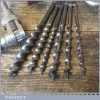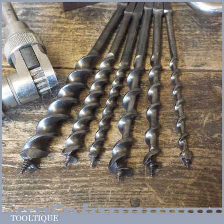Vintage Stanley No: 73 wooden handled ratchet brace and a selection of 6 double spur auger bits in good used condition. The brace has a 10” swing.