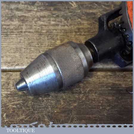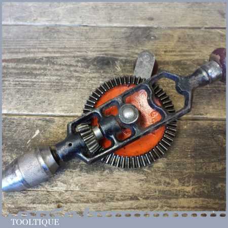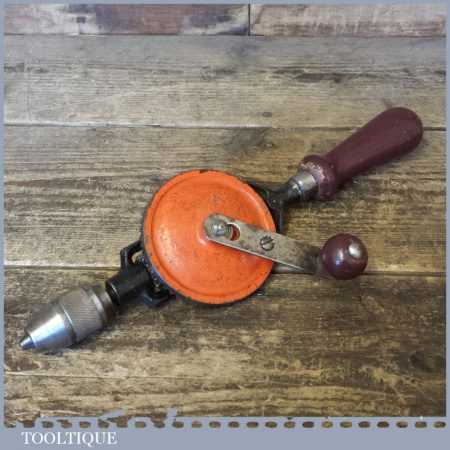 Vintage Stanley No: 805 single pinion egg beater hand drill with a keyless chuck in good used working condition. This drill has been cleaned and oiled so that all the parts move freely.