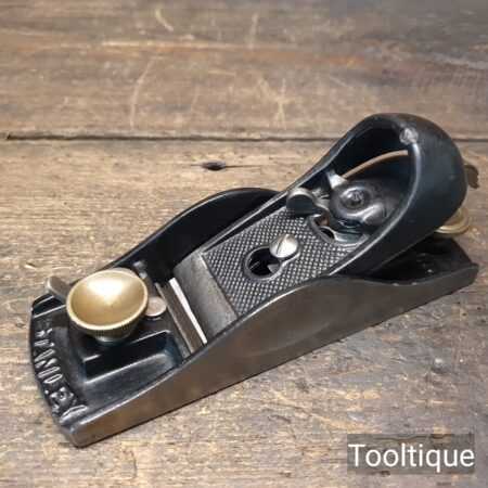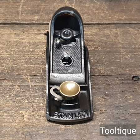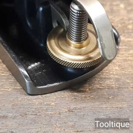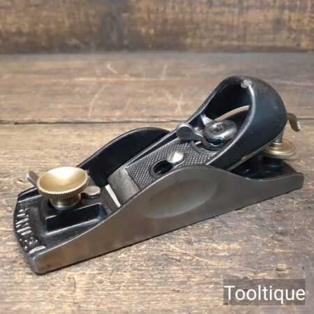Vintage Stanley England No: 9 ½ Adjustable Throat Block Plane in good used condition. When refurbishing planes, we do not merely clean them to make them look good, they are restored to a level that ensures this plane is actually ‘in plane to within 0.01mm’ sharpened, honed and all the components are thoroughly cleaned so that they move freely. Our planes are specifically reconditioned to satisfy professional tradesmen who will instantly know the difference between buying one of our planes over general other used ones.