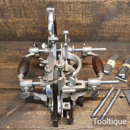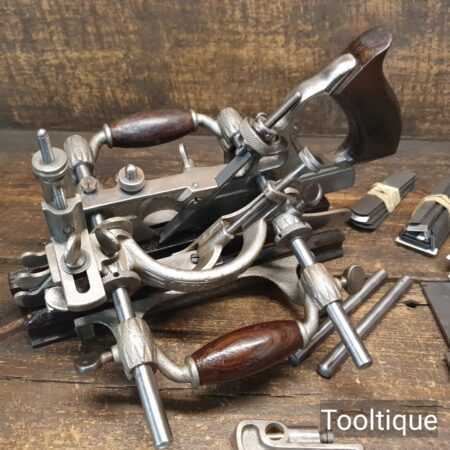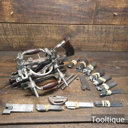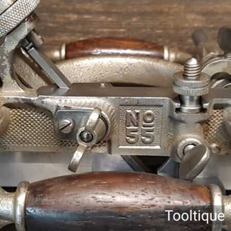 Vintage Stanley Rule & level USA No: 55 combination plough plane complete with full set of cutters, fully refurbished ready for use and in good used condition. Note: We do not sharpen the irons. This comes in a suitable solid card butter box similar in size to original.
