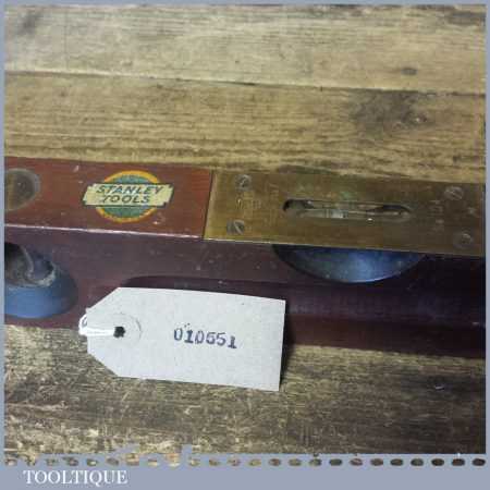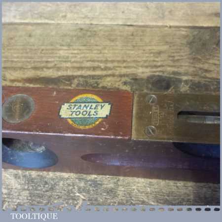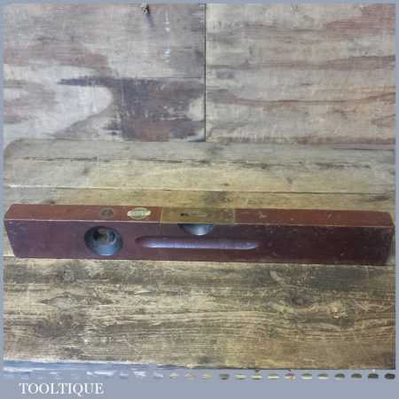 Vintage Stanley Sweetheart USA No: 104 18” mahogany and brass spirit level with original clear bubble tubes and decal in good used condition. Note: the level hasn’t been tested and may require resetting in putty if intended for use.