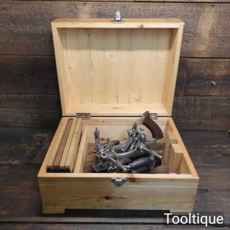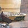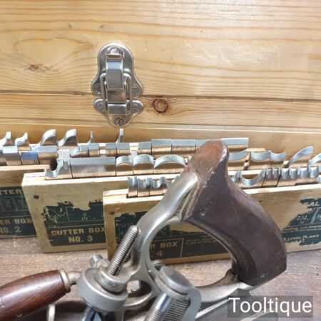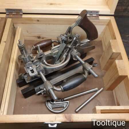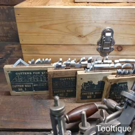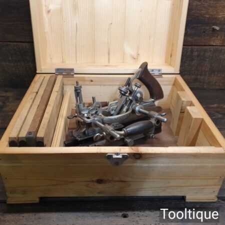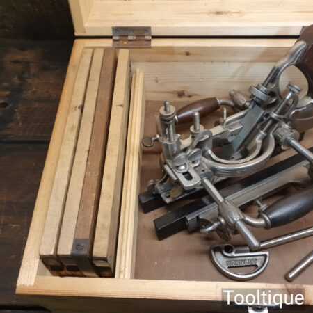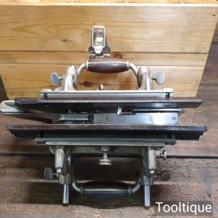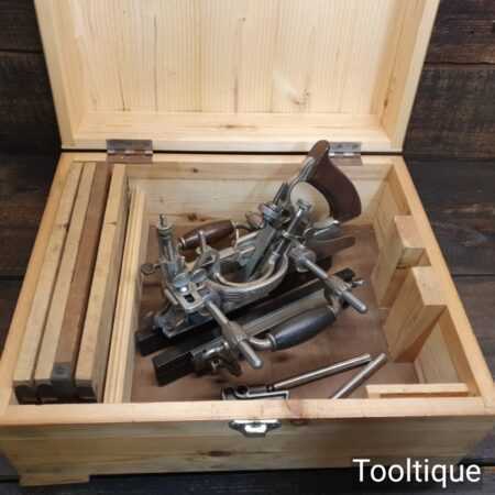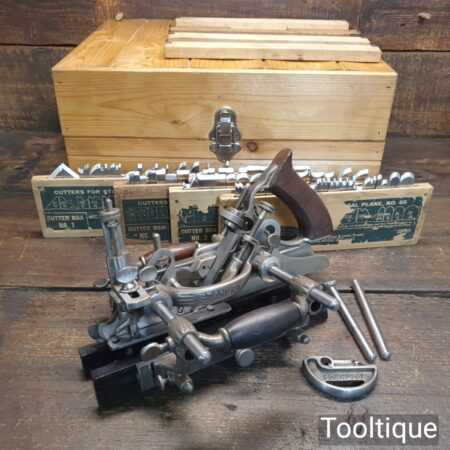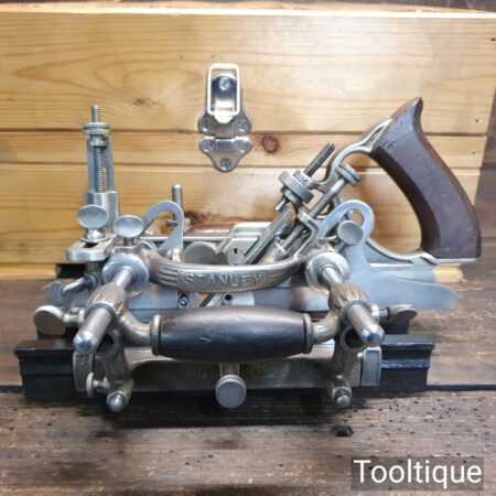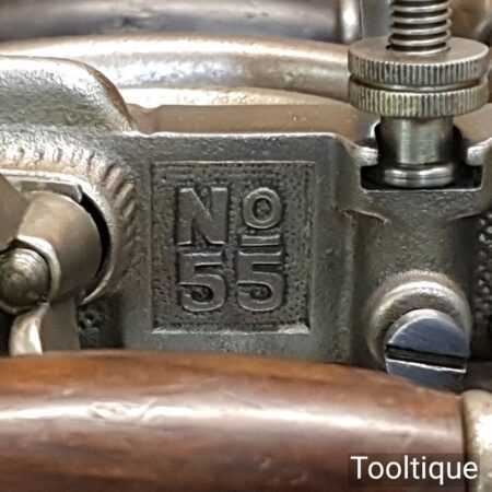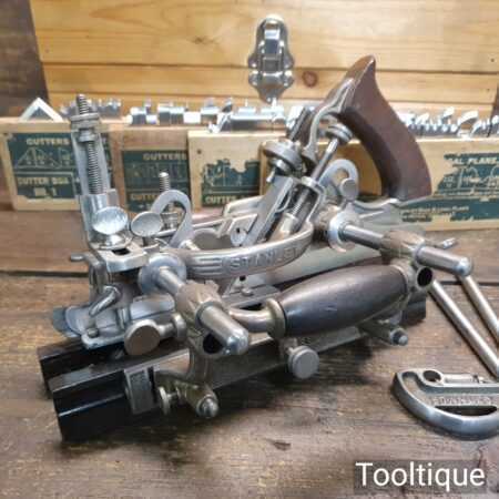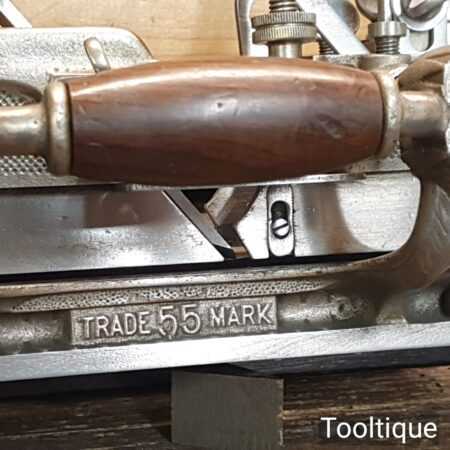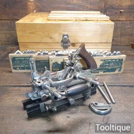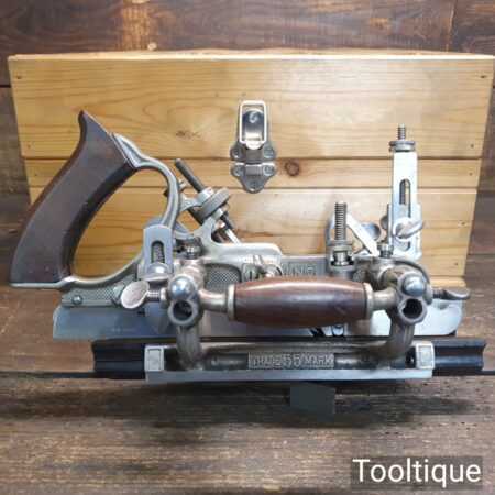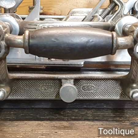 Vintage Stanley Sweetheart USA No: 55 combination plough plane complete with full set of cutters and in custom made box, fully refurbished ready for use and in good used condition. Note: We do not sharpen the irons. Note: chip to one of the rosewood guides, more cosmetic than an issue (see images).
