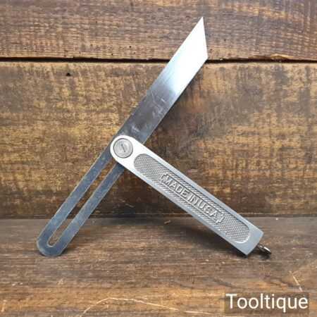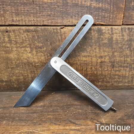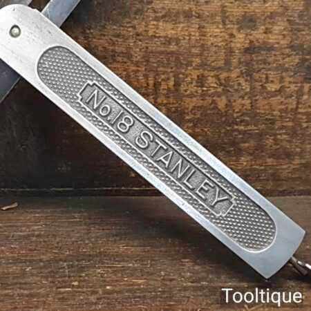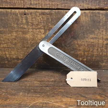 Vintage Stanley USA No: 18 quick release adjustable sliding bevel with locking screw at the bottom, in great used condition. These are getting so hard to get hold of now and are a lovely super quality tool to own. Note: this one retains most of its original nickel coating.
