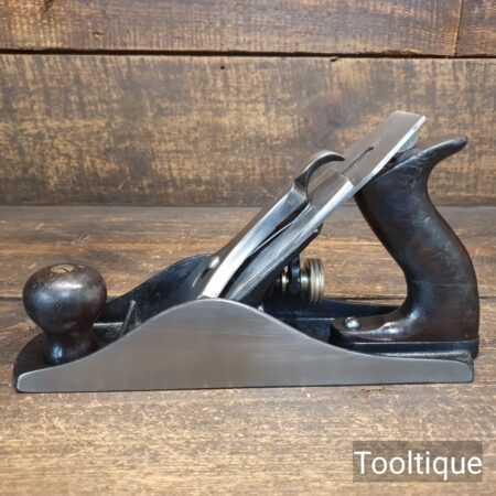 Vintage Stanley USA No: 4 ½ wide bodied smoothing plane Pat date (Apr 19-10) with a low knob and rosewood handles, fully refurbished and in good used condition, ready to use. Note: Plane has an USA iron and crack in handle but has been repaired fully and is smooth.
