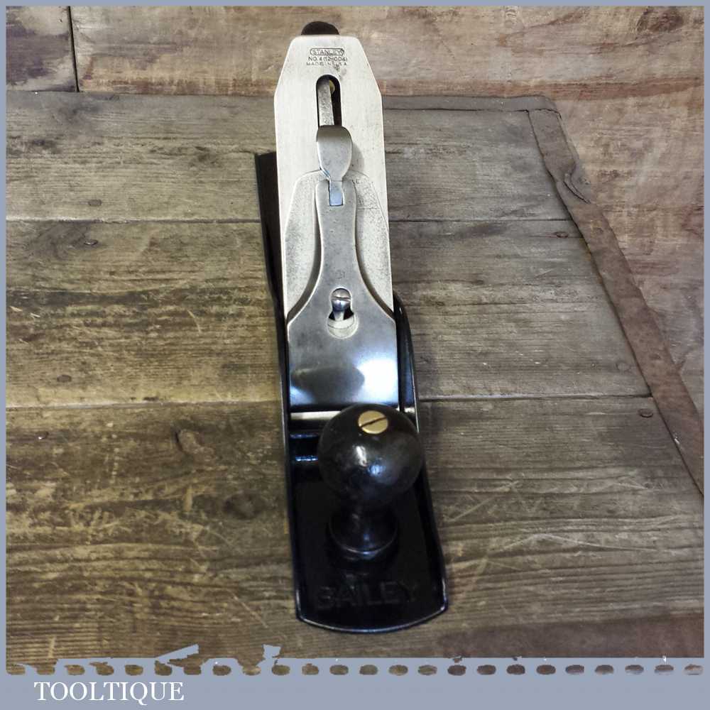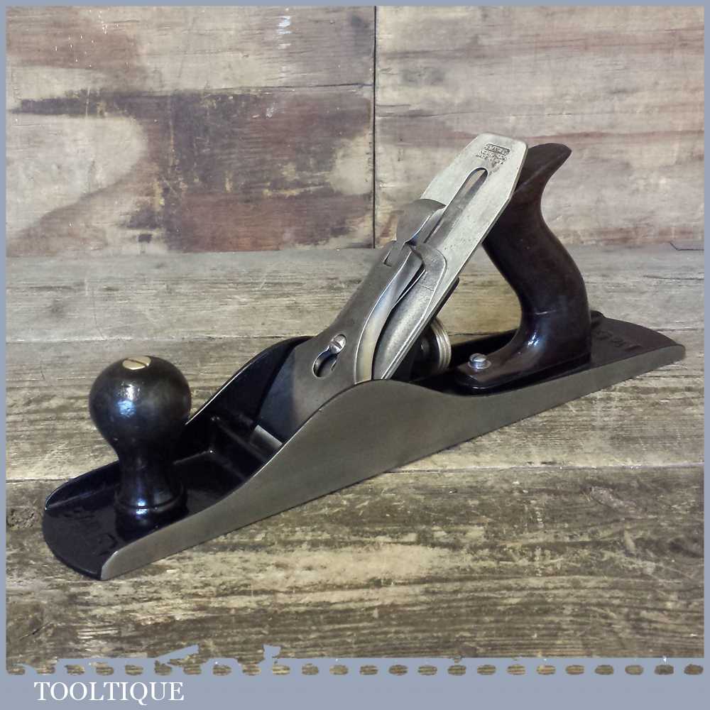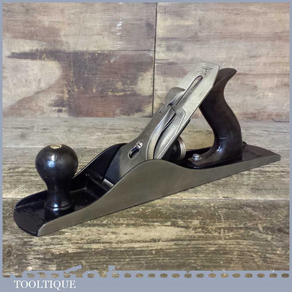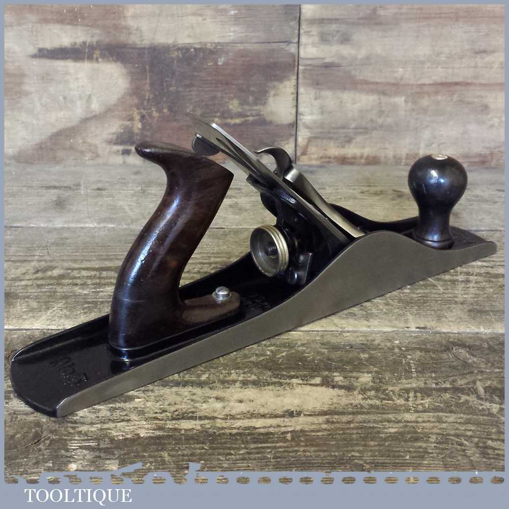 Vintage Stanley USA No: 5 jack plane fully refurbished ready to use Patent date Apr 19 10. This plane has rosewood handles although the cracked rear tote has been repaired properly and is stable. These also have a lighter casting than the later models.