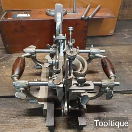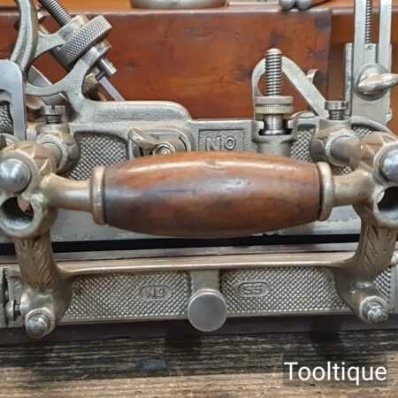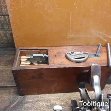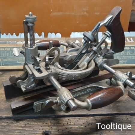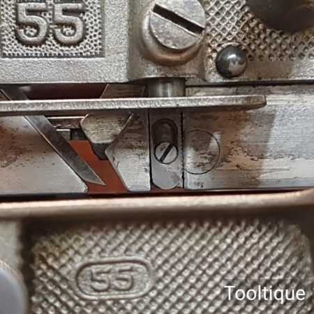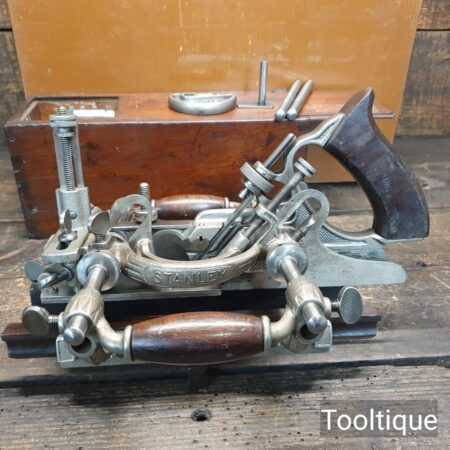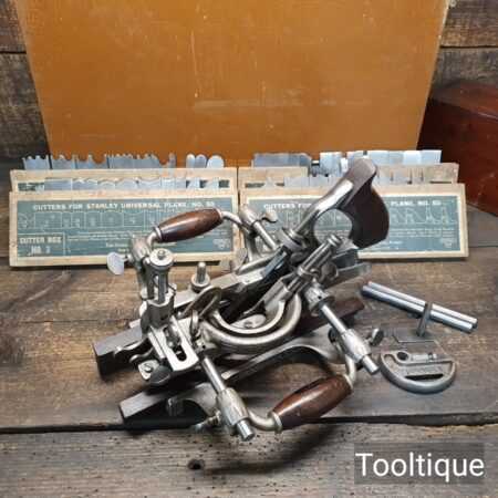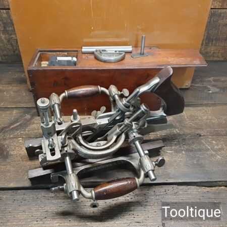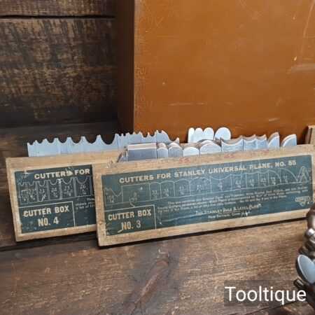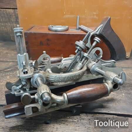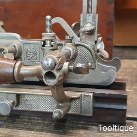 Vintage Stanley USA No: 55 combination plough plane complete with full set of cutters and parts, fully refurbished ready for use for smooth adjustment and in good used condition. Note: Minor detail, Locking screw on front of one fence replacement with correct thread but not original. Comes in a wooden locking case and blades house in a wooden box which to be fair make it easy to keep this organised and store.