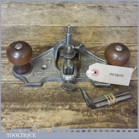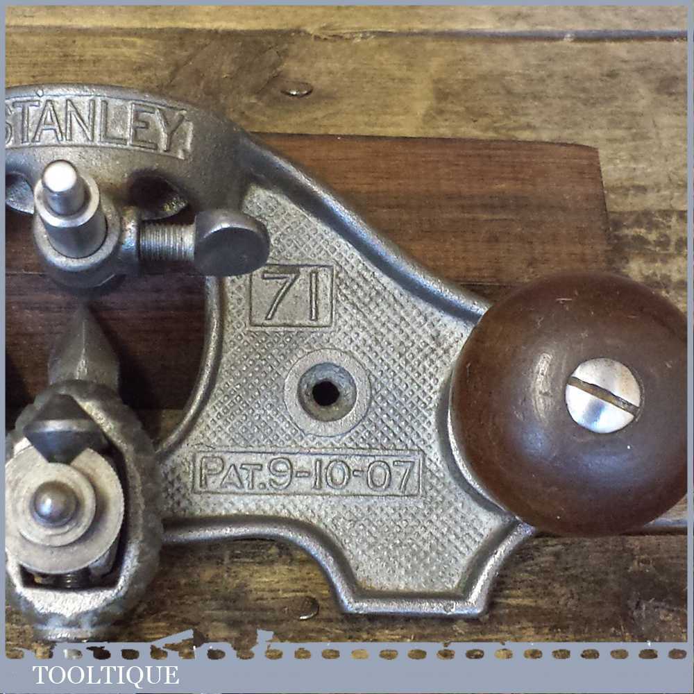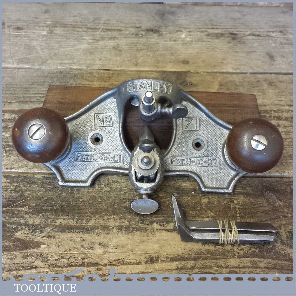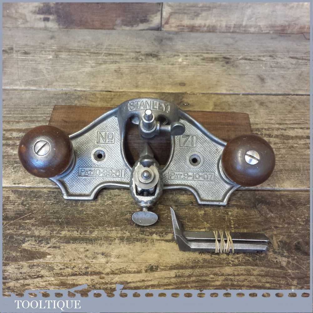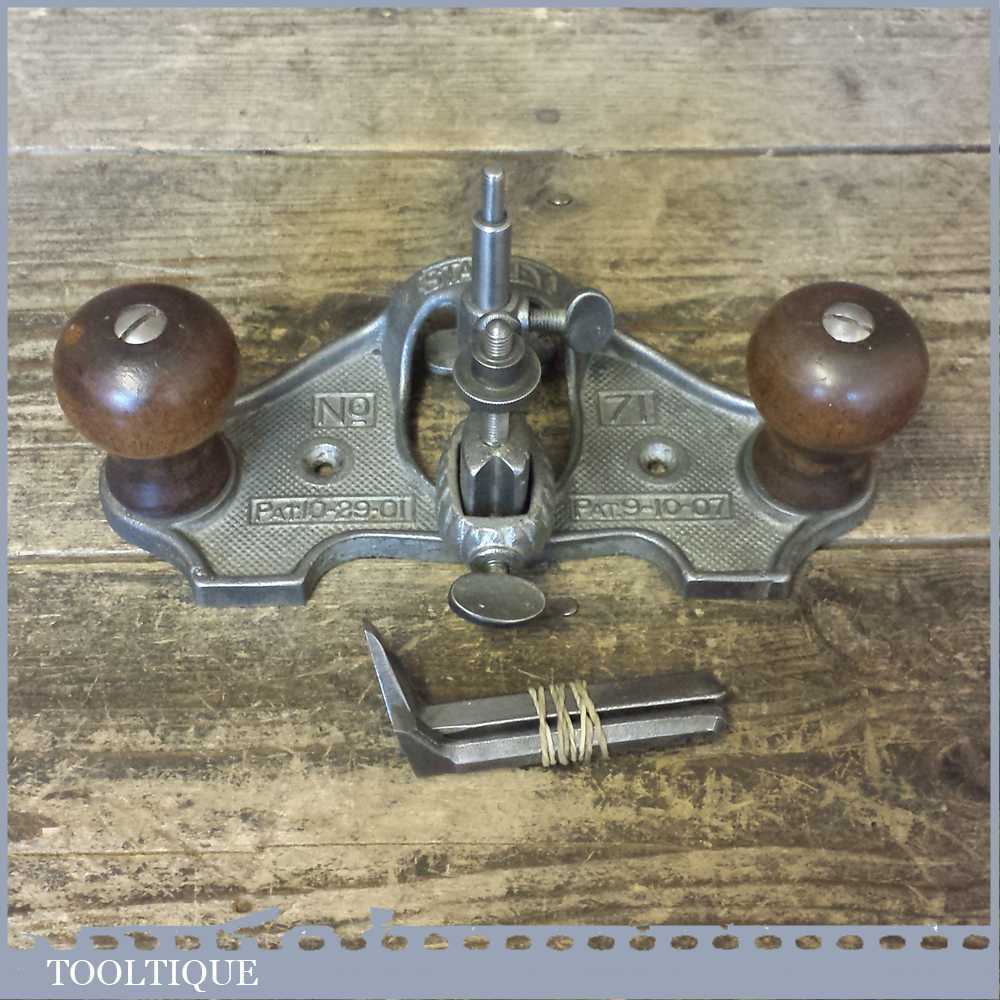 Vintage Stanley USA No: 71 hand router PAT No: 10-29-01 with 3 no: cutters in good used condition. Note: These early routers don’t have a guide like the later models.