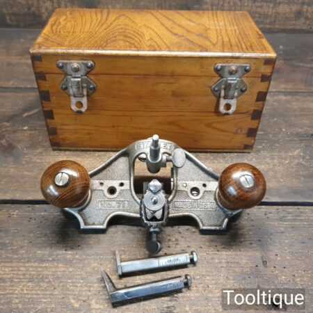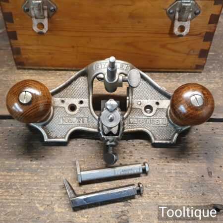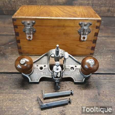 Vintage Stanley USA No: 71 hand router plane complete with fence in wooden box, depth stop and 3 irons and in good used condition.