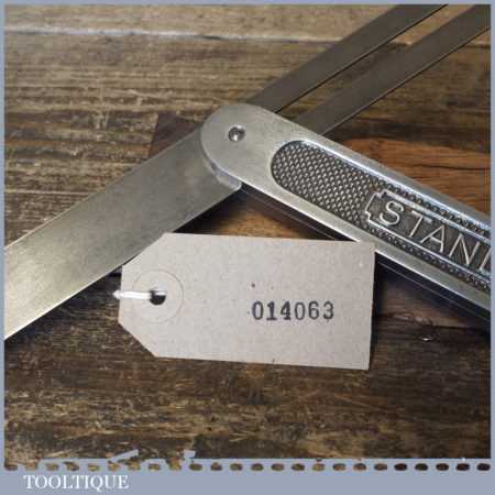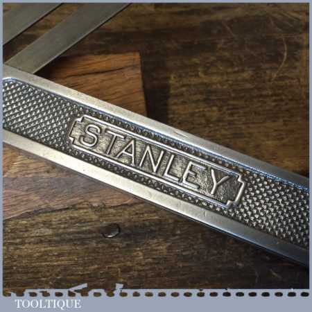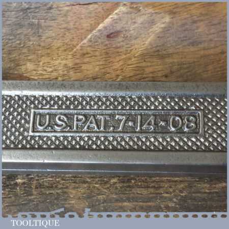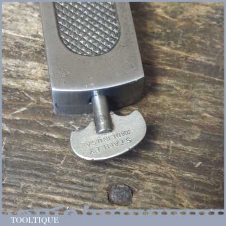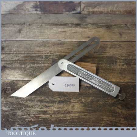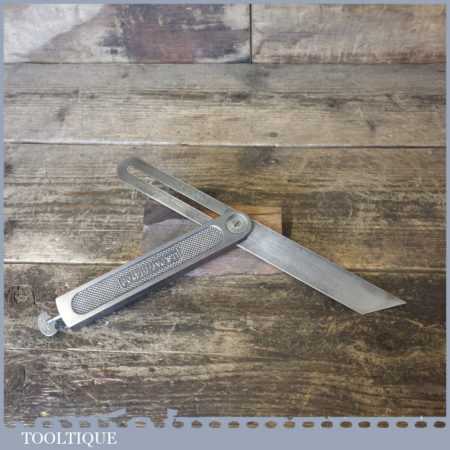 Vintage Stanley USA quick release steel sliding bevel, Pat dated 7-14-08 in good used condition, everything moves freely and it works as it should. This bevel has a 9 ¾” blade and quick release adjustment set screw at the base of the main body.