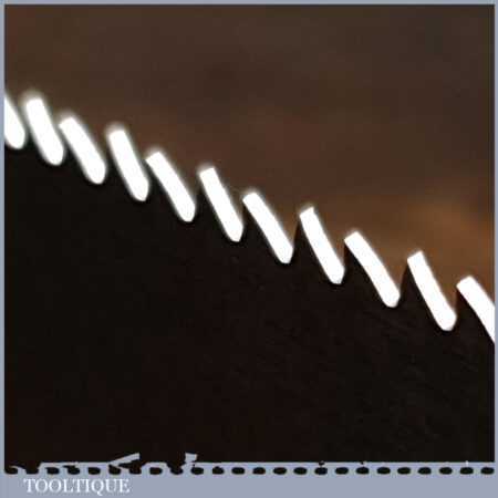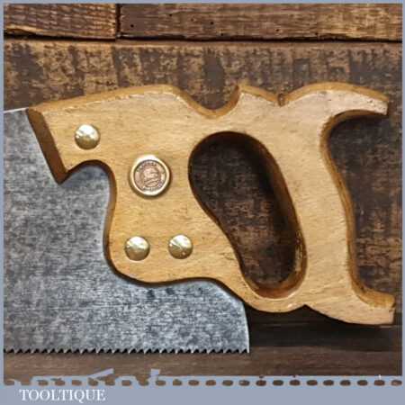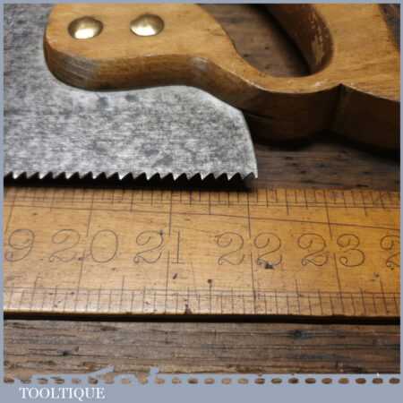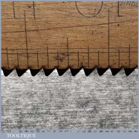 The saw has been thoroughly cleaned, jointed, resharpened and set by hand so that all the hard work of getting an old vintage saw right has been undertaken. We do this so that the next sharpening is easier and no more than a quick freshen up would be required. Those who are familiar with sharpening will know this is no small job and requires skill, effort and time to achieve good results.