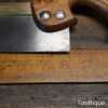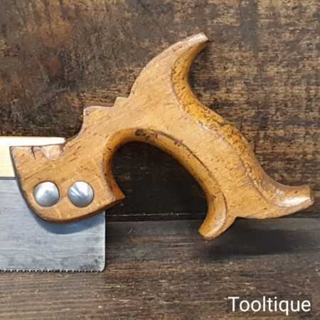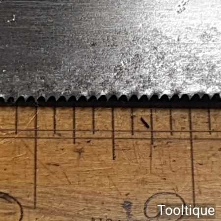 The saw has been thoroughly cleaned, jointed, resharpened, and set by hand so that all the hard work of getting an old vintage saw right has been undertaken. We do this so that the next sharpening is easier and no more than a quick freshen up would be required. Those who are familiar with sharpening will know this is no small job and requires skill, effort, and time to achieve good results.