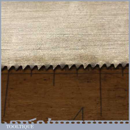 The saw has been thoroughly cleaned including under the handle, jointed, resharpened and set by hand so that all the hard work of getting an old vintage saw right has been undertaken. We do this so that the next sharpening is easier and no more than a quick freshen up would be required. Those who are familiar with sharpening will know this is no small job and requires skill, effort and time to achieve good results.