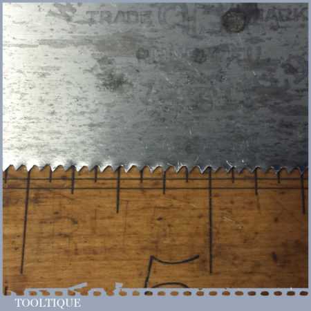 The saw has been thoroughly cleaned, jointed, resharpened and set by hand so that all the hard work of getting an old vintage saw right has been undertaken. We do this so that the next sharpening is easier and no more than a quick freshen up would be required. Those who are familiar with sharpening will know this is no small job and requires skill, effort and time to achieve good results.