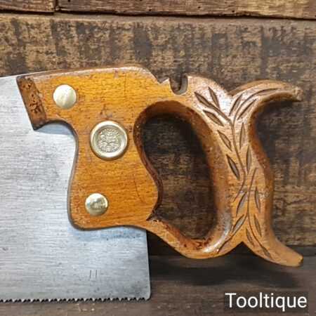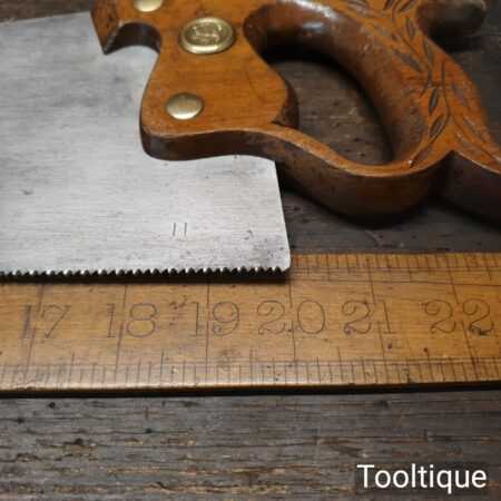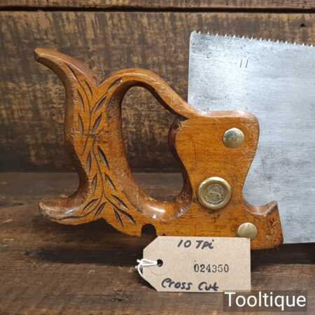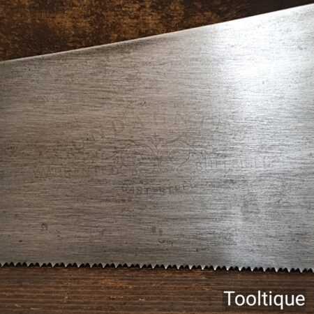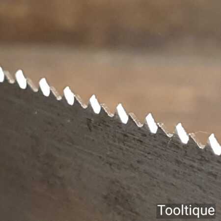 The saw has been thoroughly cleaned, jointed, resharpened and set by hand so that all the hard work of getting an old vintage saw right has been undertaken. We do this so that the next sharpening is easier and no more than a quick freshen up would be required. Those who are familiar with sharpening will know this is no small job and requires skill, effort and time to achieve good results.