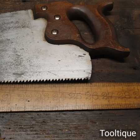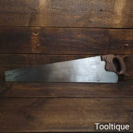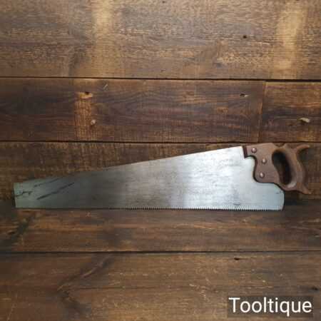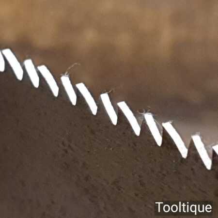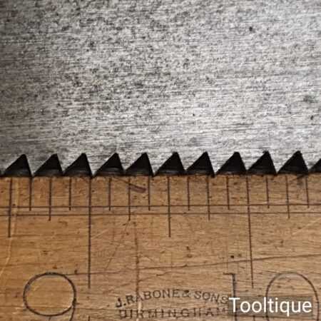 The saw has been thoroughly cleaned, jointed, resharpened and set by hand so that all the hard work of getting an old vintage saw right has been undertaken. We do this so that the next sharpening is easier and no more than a quick freshen up would be required. Those who are familiar with sharpening will know this is no small job and requires skill, effort and time to achieve good results.