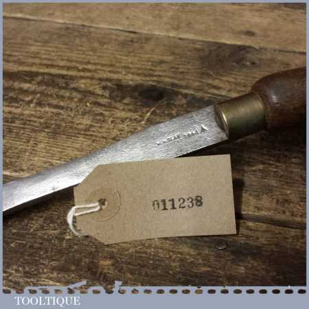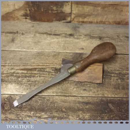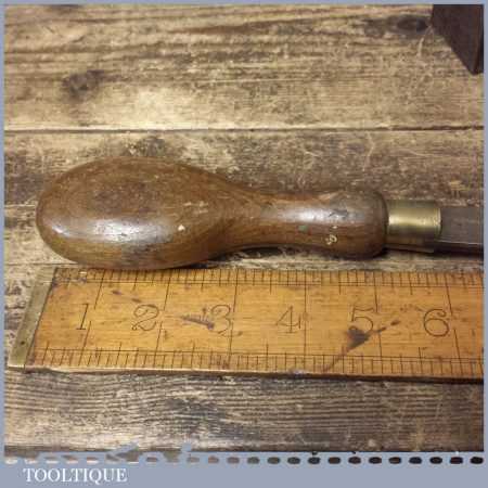 Vintage W. H. Clay cabinet maker’s 12” turnscrew screwdriver with beechwood handle and approx a 1/2” tip in good used condition. Stamped with crowsfoot broad arrow and dated 1941.