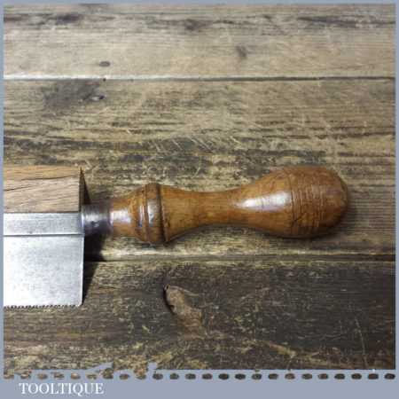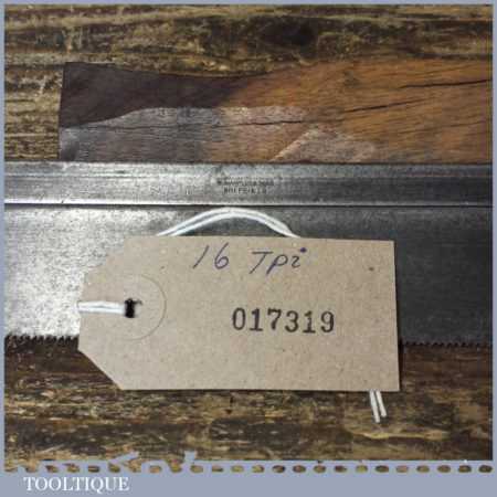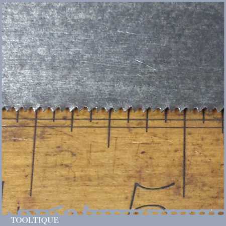 The saw has been thoroughly cleaned including under the handle, jointed, resharpened and set by hand so that all the hard work of getting an old vintage saw right has been undertaken. We do this so that the next sharpening is easier and no more than a quick freshen up would be required. Those who are familiar with sharpening will know this is no small job and requires skill, effort and time to achieve good results.
