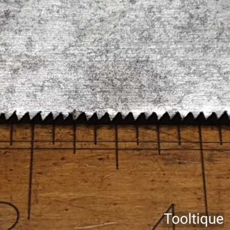 The saw has been thoroughly cleaned including under the handle, jointed, resharpened and set by hand so that all the hard work of getting an old vintage saw right has been undertaken. We do this so that the next sharpening is easier and no more than a quick freshen up would be required. Those who are familiar with sharpening will know this is no small job and requires skill, effort and time to achieve good results.