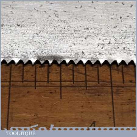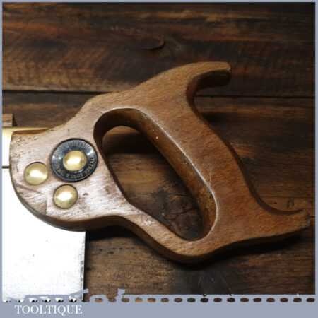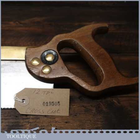 The saw has been thoroughly cleaned including under the handle, jointed, resharpened and set by hand so that all the hard work of getting an old vintage saw right has been undertaken. We do this so that the next sharpening is easier and no more than a quick freshen up would be required. Those who are familiar with sharpening will know this is no small job and requires skill, effort and time to achieve good results