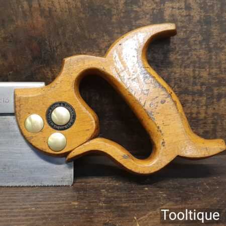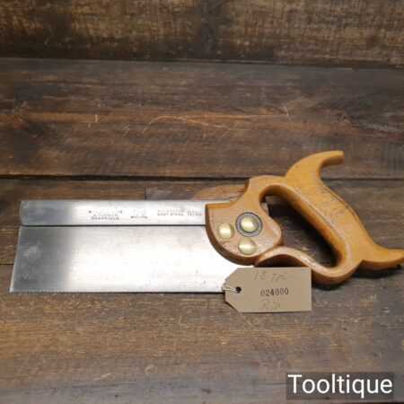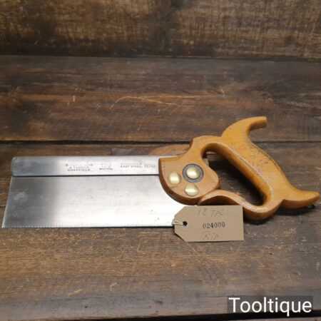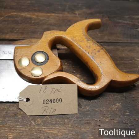 The saw has been thoroughly cleaned including under the handle, jointed, resharpened and set by hand so that all the hard work of getting an old vintage saw right has been undertaken. We do this so that the next sharpening is easier and no more than a quick freshen up would be required. Those who are familiar with sharpening will know this is no small job and requires skill, effort and time to achieve good results.