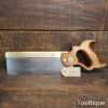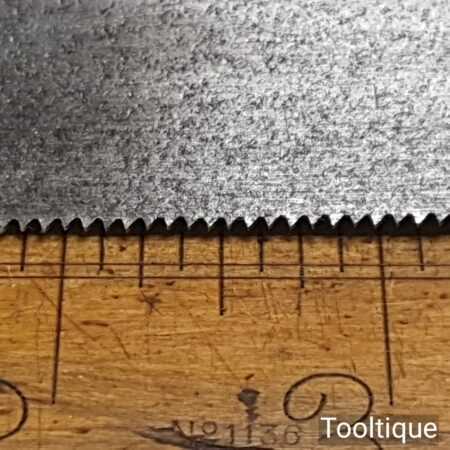 The saw has been thoroughly cleaned including under the handle, jointed, resharpened and set by hand so that all the hard work of getting an old vintage saw right has been undertaken. We do this so that the next sharpening is easier and no more than a quick freshen up would be required. Those who are familiar with sharpening will know this is no small job and requires skill, effort and time to achieve good results