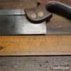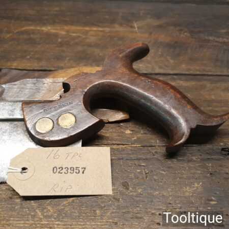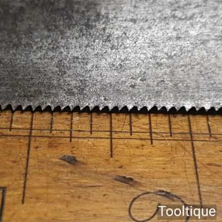 The saw has been thoroughly cleaned including under the handle, jointed, resharpened and set by hand so that all the hard work of getting an old vintage saw right has been undertaken. We do this so that the next sharpening is easier and no more than a quick freshen up would be required. Those who are familiar with sharpening will know this is no small job and requires skill, effort and time to achieve good results.