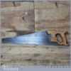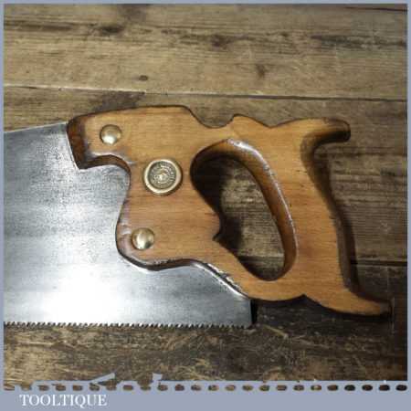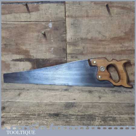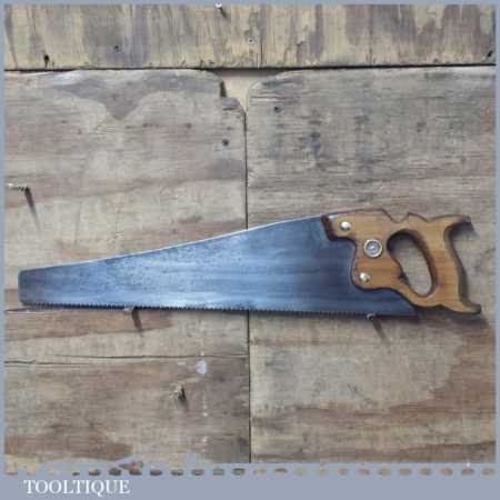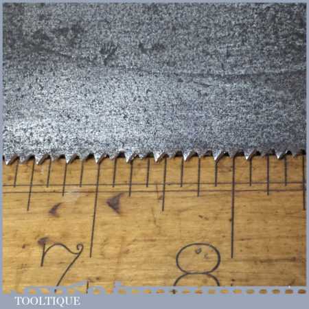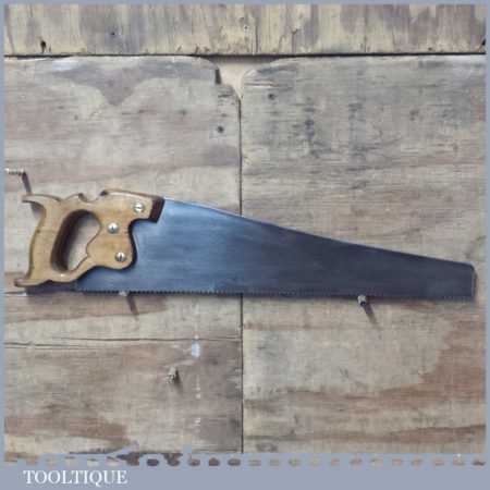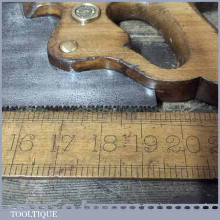 The saw has been thoroughly cleaned including under the handle, jointed, resharpened and set by hand so that all the hard work of getting an old vintage saw right has been undertaken. We do this so that the next sharpening is easier and no more than a quick freshen up would be required. Those who are familiar with sharpening will know this is no small job and requires skill, effort and time to achieve good results.