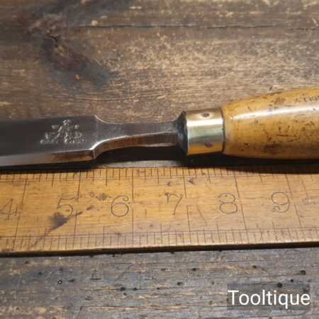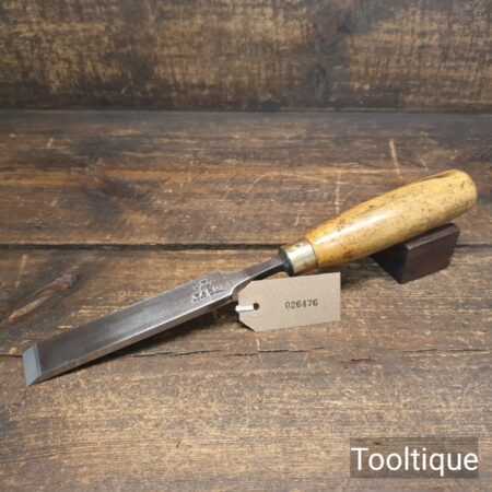 Vintage Ward & Payne 1” firmer chisel with boxwood handle in good used condition, fully refurbished sharpened and honed ready for use. Note: Crack in top of handle but has been resin treated, it wasn’t bad enough to change.