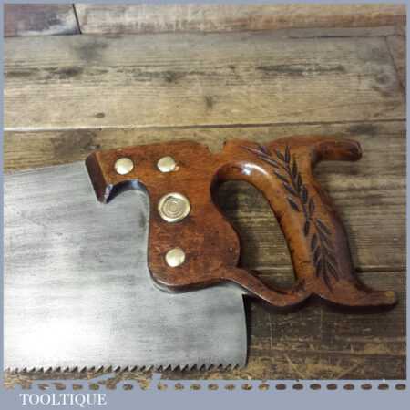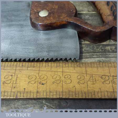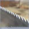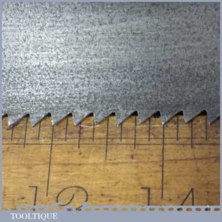 The saw has been thoroughly cleaned, jointed, resharpened and set by hand so that all the hard work of getting an old vintage saw right has been undertaken. We do this so that the next sharpening is easier and no more than a quick freshen up would be required. Those who are familiar with sharpening will know this is no small job and requires skill, effort and time to achieve good results.