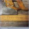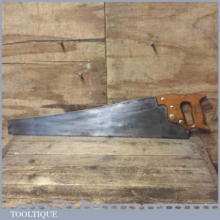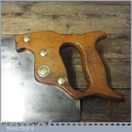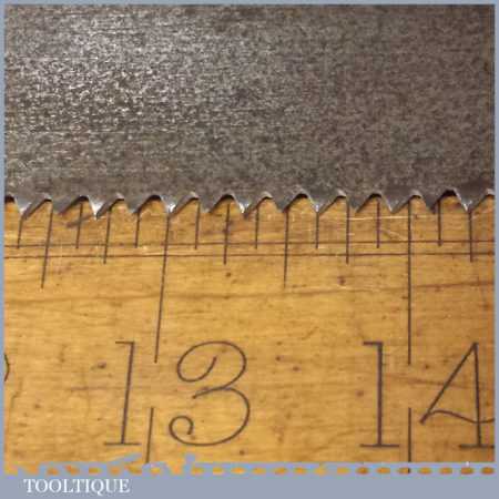 The saw has been thoroughly cleaned including under the handle, jointed, resharpened and set by hand so that all the hard work of getting an old vintage saw right has been undertaken. We do this so that the next sharpening is easier and no more than a quick freshen up would be required. Those who are familiar with sharpening will know this is no small job and requires skill, effort and time to achieve good results.