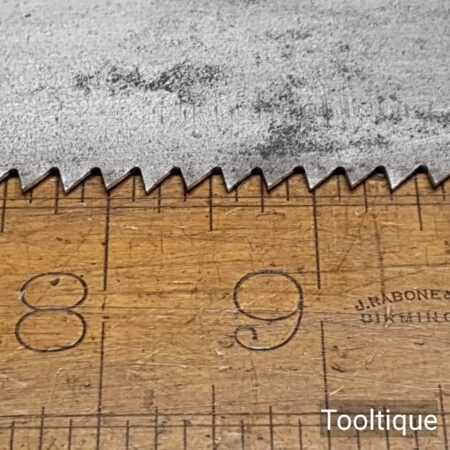 The saw has been thoroughly cleaned, jointed, resharpened and set by hand so that all the hard work of getting an old vintage saw right has been undertaken. We do this so that the next sharpening is easier and no more than a quick freshen up would be required. Those who are familiar with sharpening will know this is no small job and requires skill, effort and time to achieve good results.