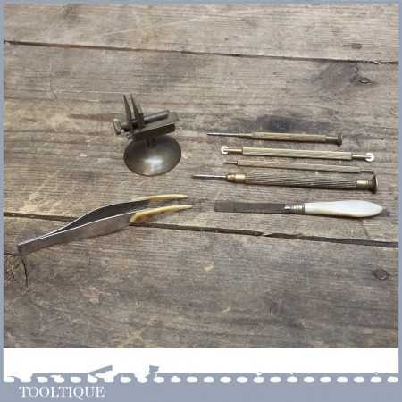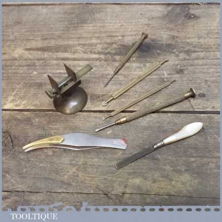 Variety of vintage watchmakers tools including bone ended tweezers a clamping tool, bone handled file and screwdrivers etc.