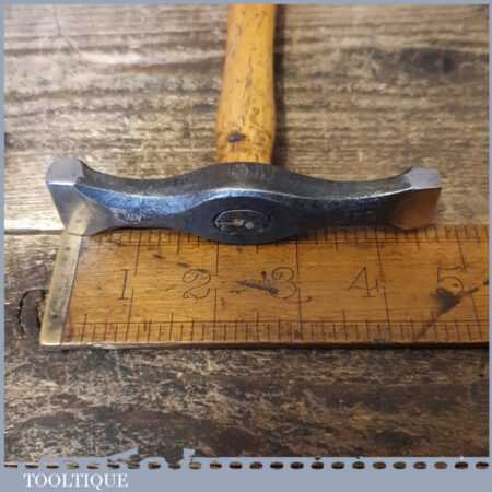 Vintage William Whitehouse and Co (Atlas Forge) panel beaters cross pein planishing hammer with hickory handle, in good used condition. Note: The faces have a smooth mirror finish.