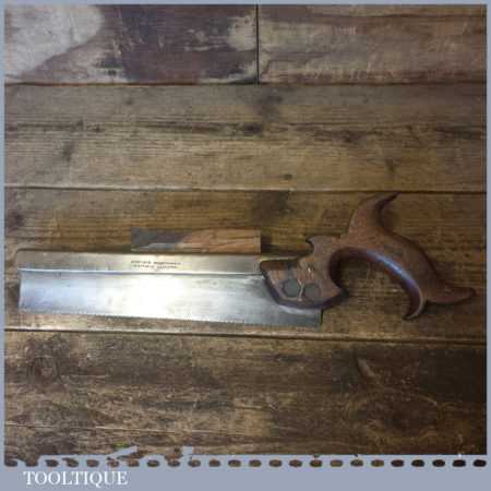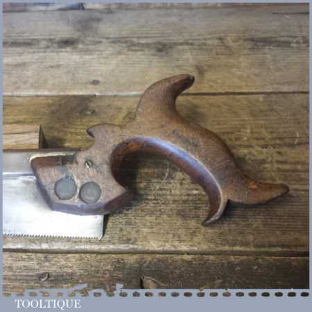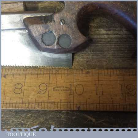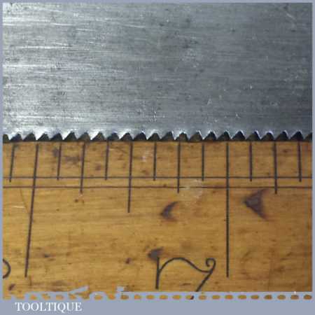 The saw has been thoroughly cleaned including under the handle, jointed, resharpened and set by hand so that all the hard work of getting an old vintage saw right has been undertaken. We do this so that the next sharpening is easier and no more than a quick freshen up would be required. Those who are familiar with sharpening will know this is no small job and requires skill, effort and time to achieve good results.