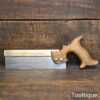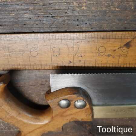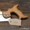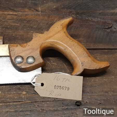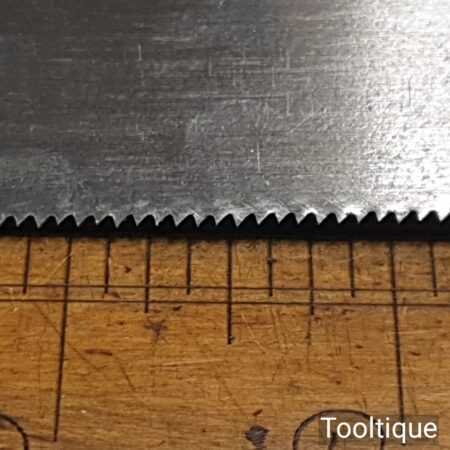 The saw has been thoroughly cleaned including under the handle, jointed, resharpened and set by hand so that all the hard work of getting an old vintage saw right has been undertaken. We do this so that the next sharpening is easier and no more than a quick freshen up would be required. Those who are familiar with sharpening will know this is no small job and requires skill, effort and time to achieve good results