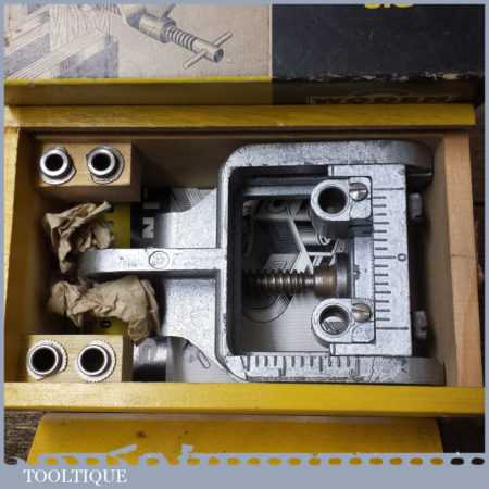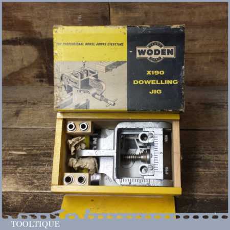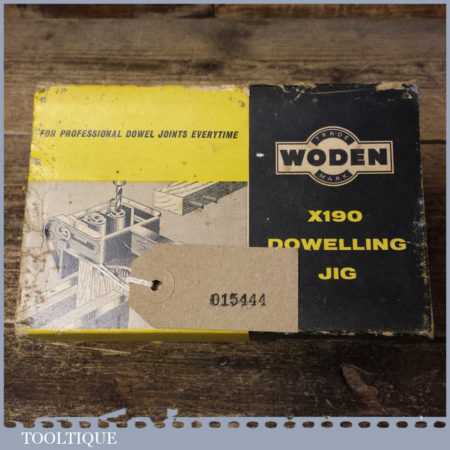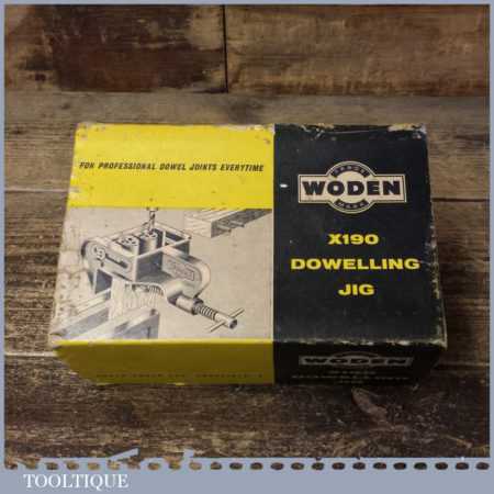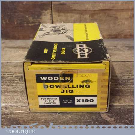 Vintage Woden X190 dowelling jig in its original wooden box and cardboard sleeve, in good lightly used condition.