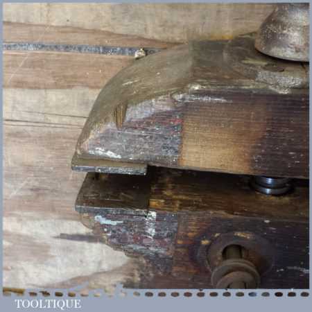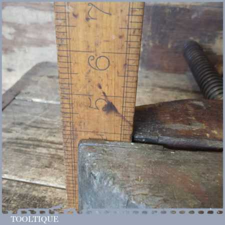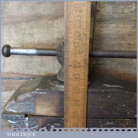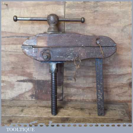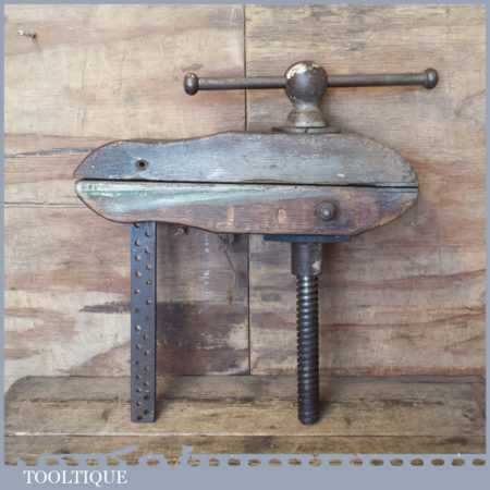 Vintage wood and metal woodcarvers vice, in used condition. This looks like it fixed to the side of a bench via the flat metal plate with many holes.